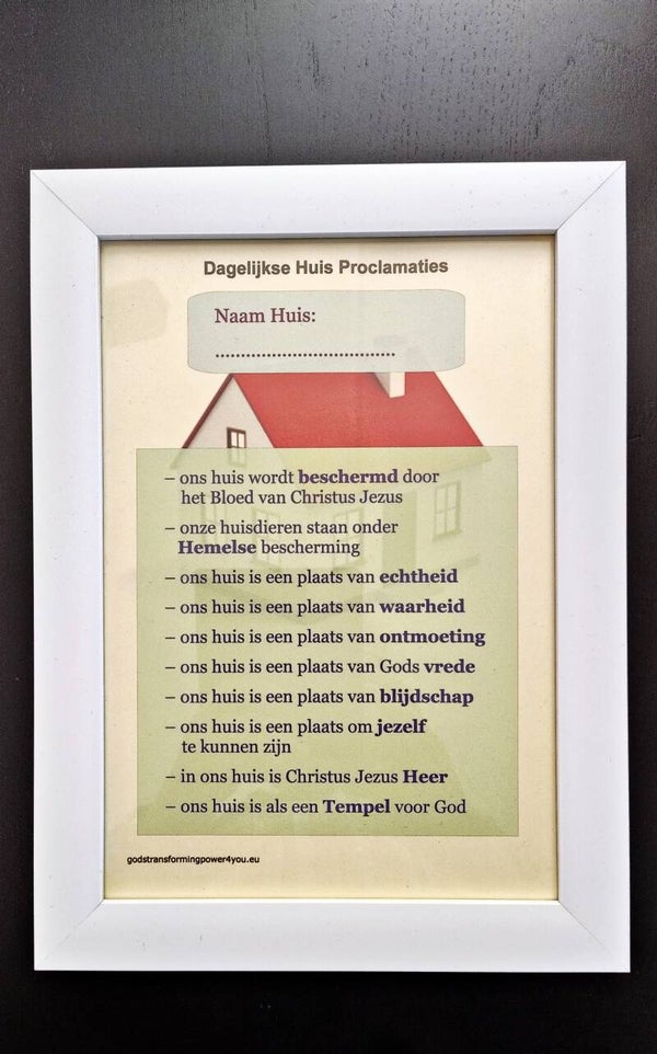 We hebben gezien dat proclameren heel erg belangrijk is. "Kan iedereen proclameren?" zul je je afvragen. Het proclameren van Gods woorden is voor iedereen die geloof heeft in de uitwerking ervan. Proclameren doe je voor jezelf, je gezin, je omgeving en ook over je huis. Daarom heb ik een aantal actuele proclamatiekaarten gemaakt en ingelijst.